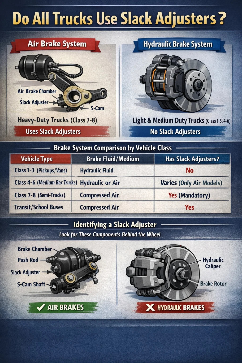 Không, không phải tất cả các xe tải đều có bộ điều chỉnh độ chùng. Việc một chiếc xe tải có được trang bị những bộ phận này hay không phụ thuộc hoàn toàn vào hệ thống phanh của nó. Cụ thể, bộ điều chỉnh chùng là một phần cơ bản của hệ thống phanh hơi được tìm thấy trên các phương tiện thương mại hạng nặng (xe tải Loại 7 và Loại 8). Xe tải hạng nhẹ, chẳng hạn như xe bán tải tiêu chuẩn (Loại 1-3) và nhiều xe tải thùng hạng trung sử dụng hệ thống phanh thủy lực, không sử dụng cơ cấu điều chỉnh độ chùng để duy trì độ hở của guốc phanh hoặc má phanh.