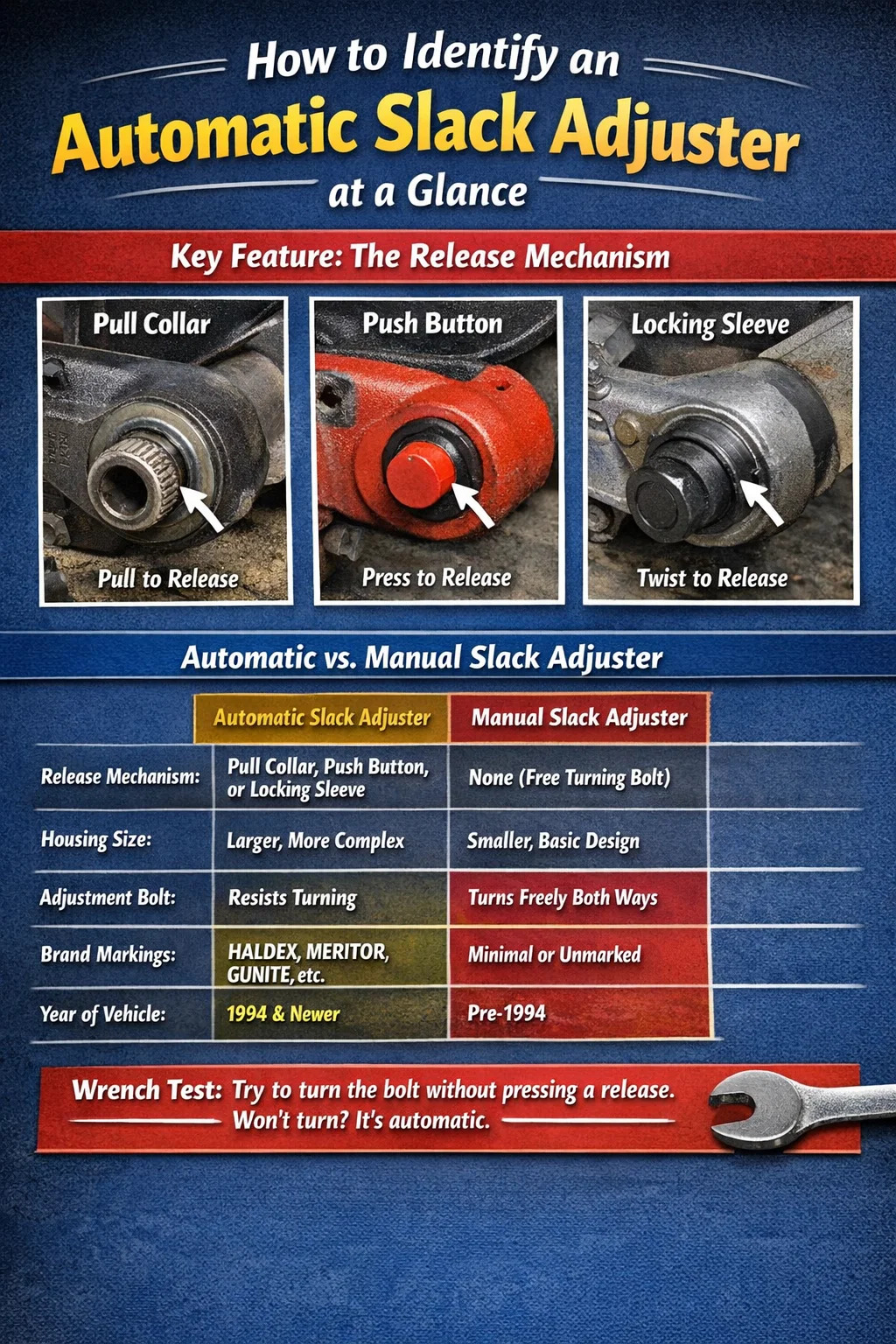 Bộ điều chỉnh độ chùng tự động có thể được xác định bằng sự hiện diện của cơ chế giải phóng trên thân điều chỉnh - vòng đệm kiểu kéo, nút ấn hoặc ống khóa - nằm gần bu lông điều chỉnh bánh răng trục vít. Tính năng nhả này là chỉ báo trực quan đáng tin cậy nhất để phân biệt bộ điều chỉnh độ chùng tự động (ASA) với bộ điều chỉnh thủ công. Trên bộ điều chỉnh thủ công, bu lông lục giác quay tự do theo cả hai hướng mà không có cơ cấu khóa. Trên bộ điều chỉnh tự động, cùng bu-lông đó được bảo vệ bằng hệ thống ly hợp hoặc chốt để ngăn chặn tình trạng lùi xe vô tình trong quá trình vận hành phanh bình thường.