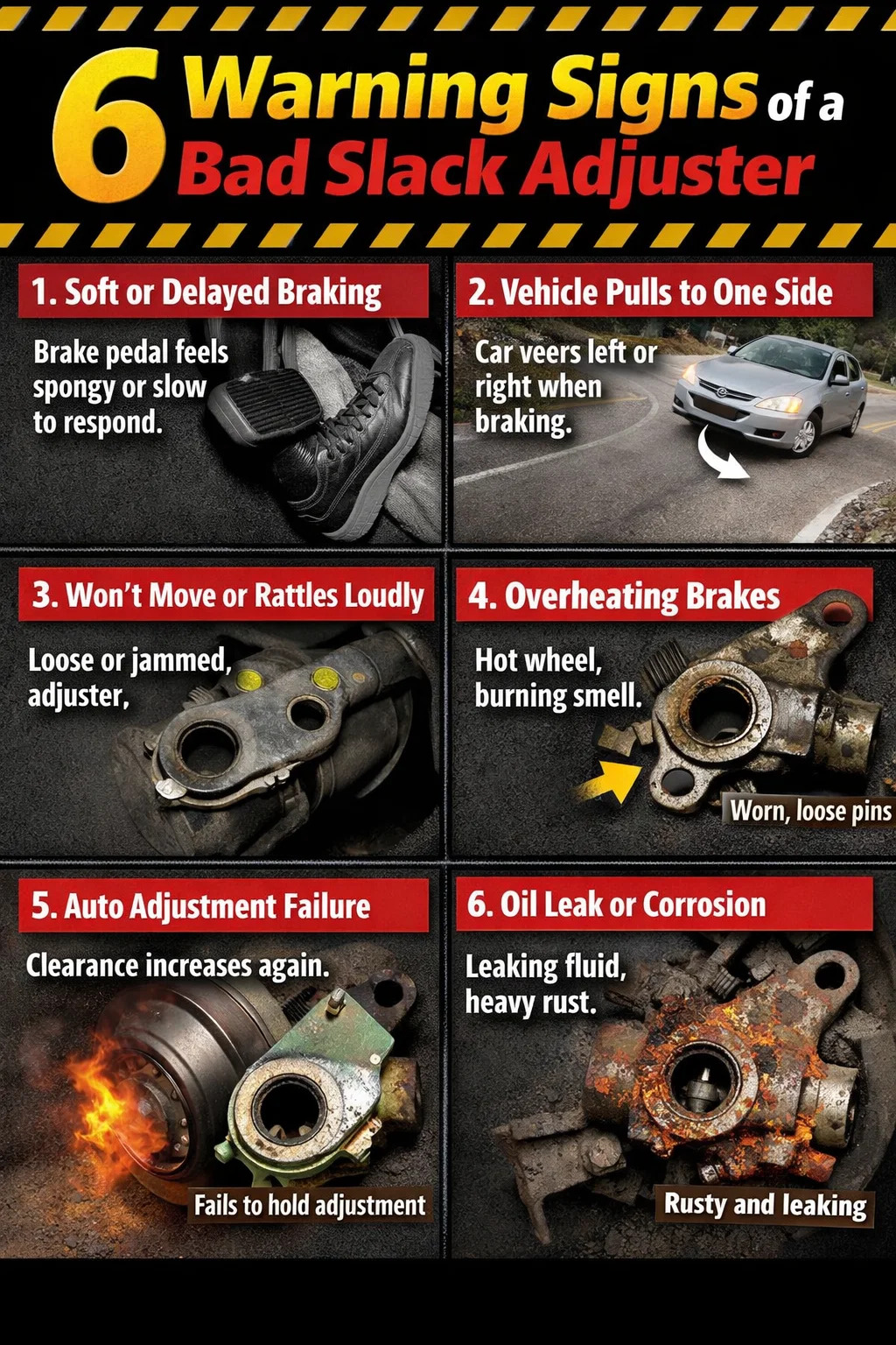 điều này thường là do bộ điều chỉnh độ chùng không bù đắp hiệu quả cho độ mòn của má phanh, dẫn đến khe hở quá lớn. Cần đẩy buồng khí phải di chuyển một quãng đường dài trước khi phanh hoạt động.