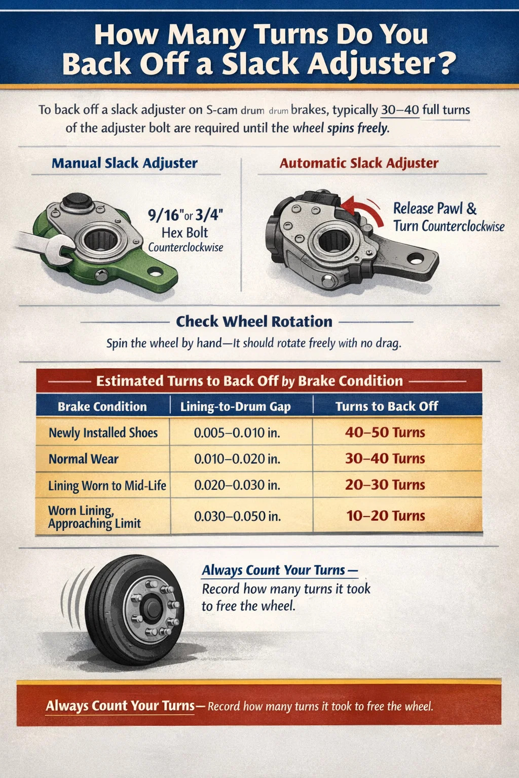 Có, nếu trống mới có đường kính bên trong khác với đường kính ban đầu. Trống được gia công hoặc thay thế bằng trống mới có đường kính tiêu chuẩn có thể sẽ cần ít vòng quay lùi hơn để rút guốc hiện có, nhưng mục tiêu điều chỉnh cuối cùng vẫn giữ nguyên: hành trình trong vòng 1,25–1,75 inch ở ứng dụng 90 psi. Luôn kiểm tra hành trình sau bất kỳ lần thay trống nào, ngay cả khi không chạm vào giày.