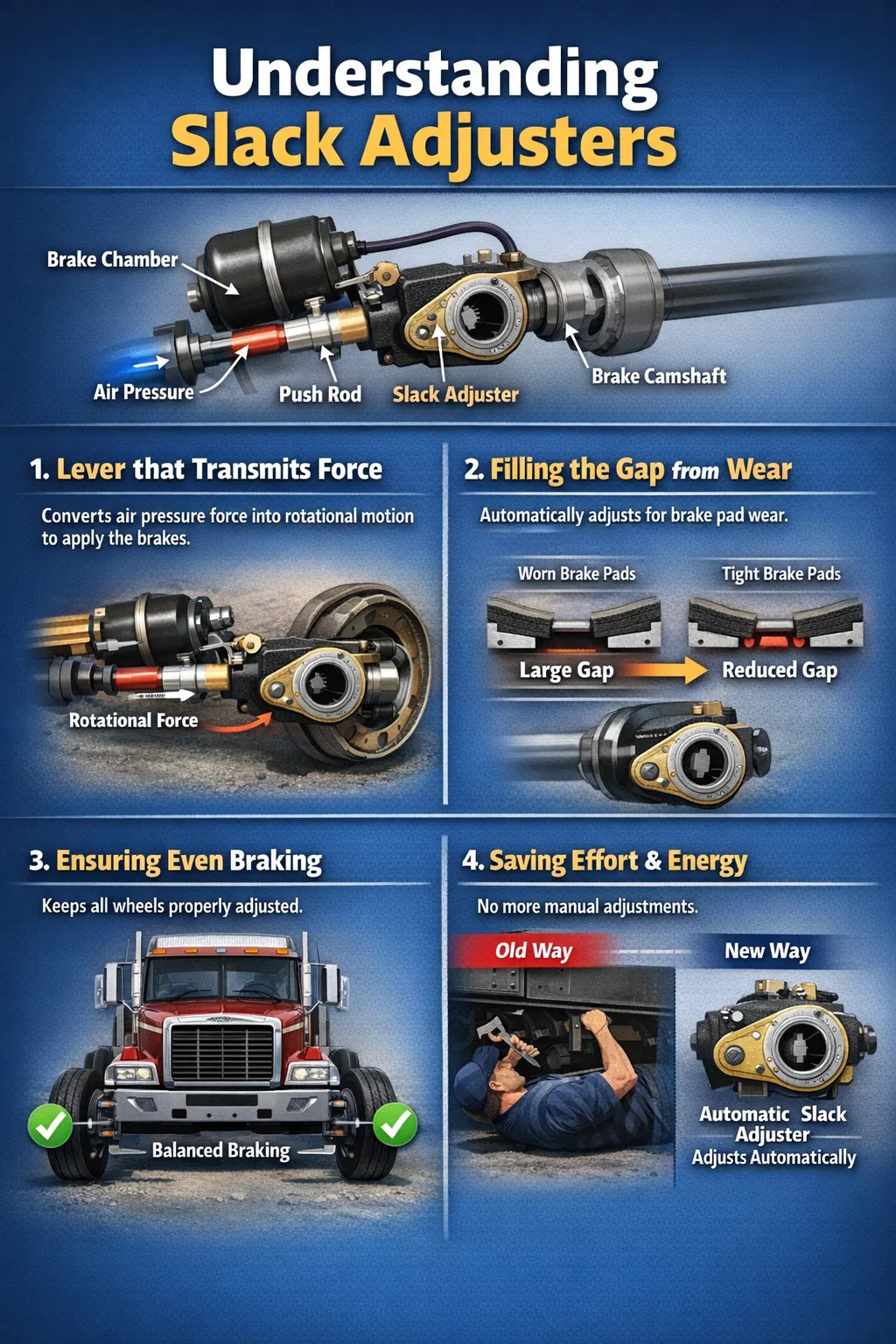 Bộ điều chỉnh chùng được ví như “người phiên dịch”, “người quản lý tự động” trong hệ thống phanh của xe tải lớn và xe buýt. Chúng nằm giữa buồng phanh và trục phanh.