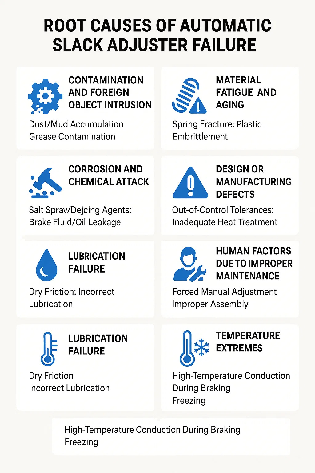 Dẫn truyền nhiệt độ cao trong quá trình phanh: Trong thời gian xuống dốc dài ở vùng núi, nhiệt từ trống phanh được chuyển sang bộ điều chỉnh, gây ra cacbon hóa dầu mỡ hoặc làm cứng con dấu.